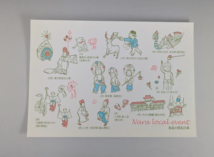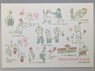 奈良の祭礼行事をかわいいイラストで表現したハガキです。3色刷りになります。