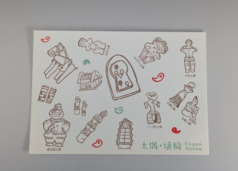 かわいい土偶と埴輪のイラストをあしらったはがきです。3色刷りになります。