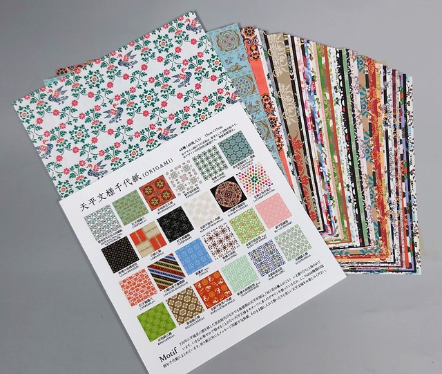 正倉院に保管されてきた宝物を図案化した、天平文様の和紙千代紙です。 48枚入り(48種×1枚) 寸法:15㎝×15cm